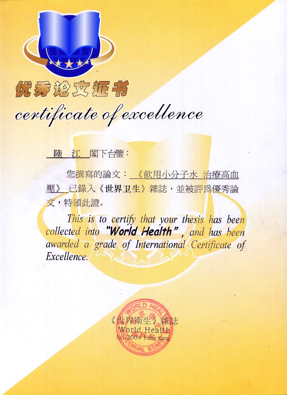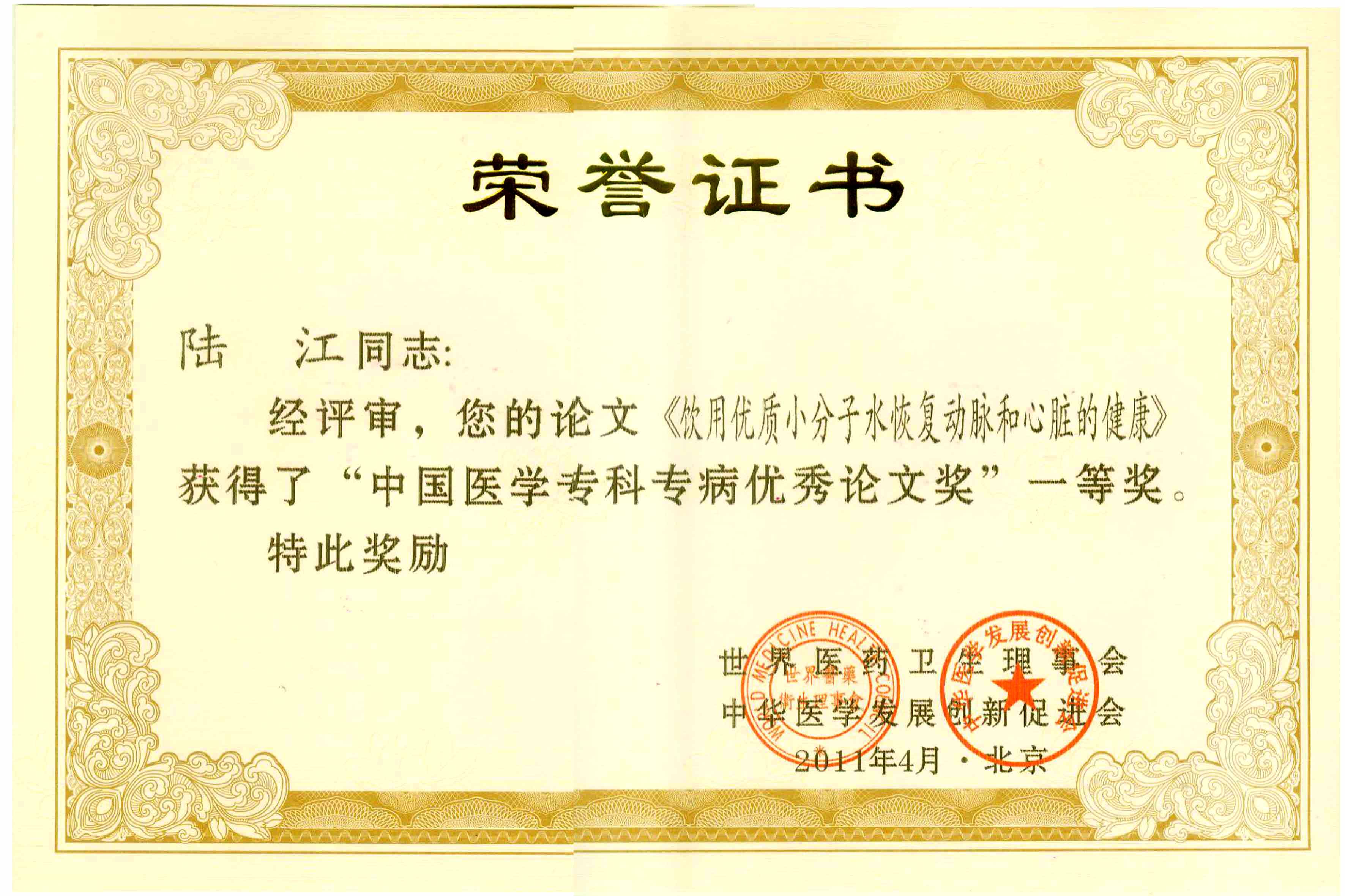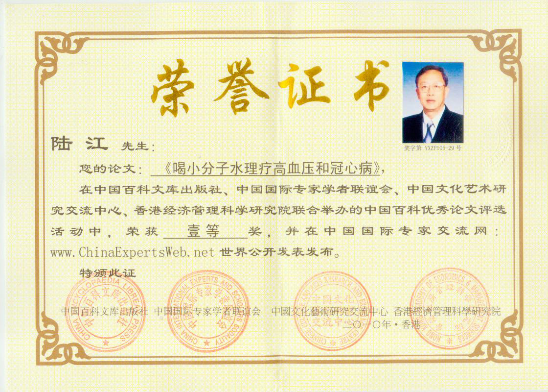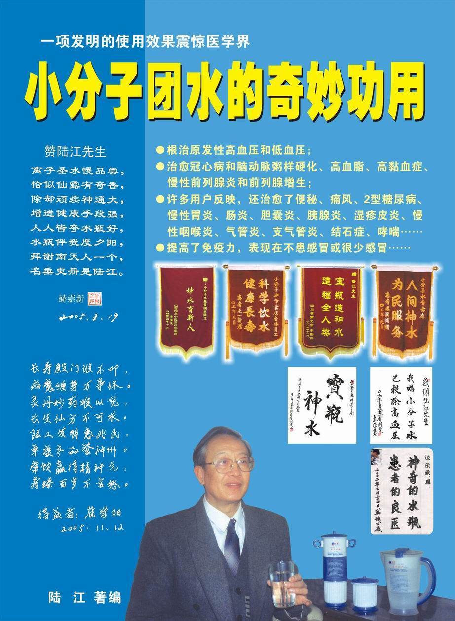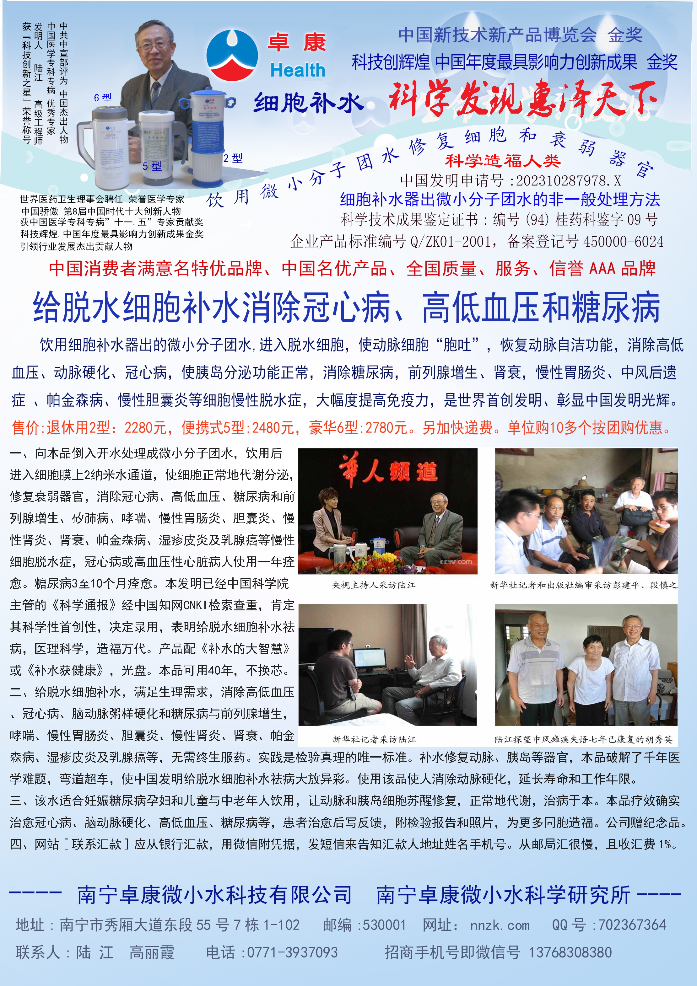 人類幾千年來患以上病癥需終生服藥,幾十年也不能治愈。可是我國南寧的高級工程師陸 江,于1990年想根治高血壓,研究發(fā)明了離子水瓶,處理出微小分子團水供飲用,經(jīng)過醫(yī)院臨床試用和專家鑒定,1999年獲中國發(fā)明專利權(quán),產(chǎn)品于2000年投放市場后一直跟蹤調(diào)查,據(jù)全國各地用戶反饋:祛除了高低血壓、糖尿病和冠心病,并使前列腺增生、咽喉炎、鼻竇炎、慢性氣管炎、支氣管炎、矽肺病、哮喘、慢性胃炎、腸炎、慢性膽囊炎、慢性腎炎、腎衰、膀胱炎、便秘、痔瘡、風濕性關(guān)節(jié)炎和濕疹皮炎及中風后遺癥等病癥不藥而愈。為什么喝微小水能治20多種病?陸 江從1991年德國科學(xué)家發(fā)現(xiàn)細胞膜水通道僅為2納米獲得啟發(fā),認為多種器官患病是因細胞脫水,不能正常代謝和分裂增殖,才使器官細胞減少致衰弱萎縮而形成細胞缺水性病癥。22年來的實踐有力地支持了“細胞脫水致病”這一重要論點,表明喝微小水可滿足細胞的生理需求,補水就能祛病,是生命科學(xué)新亮點。