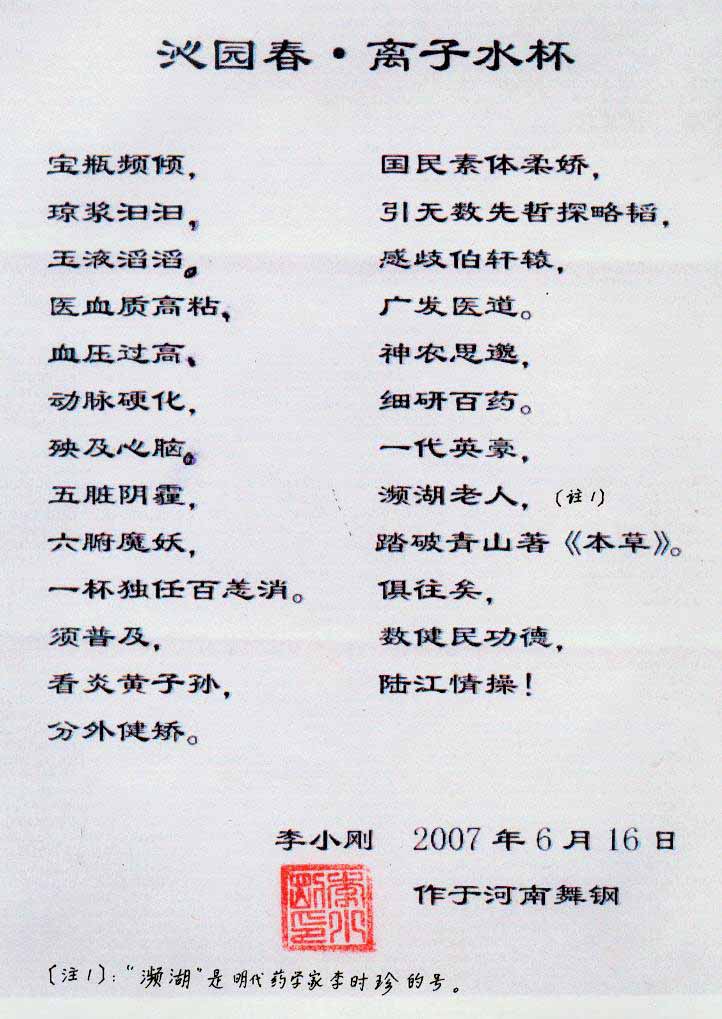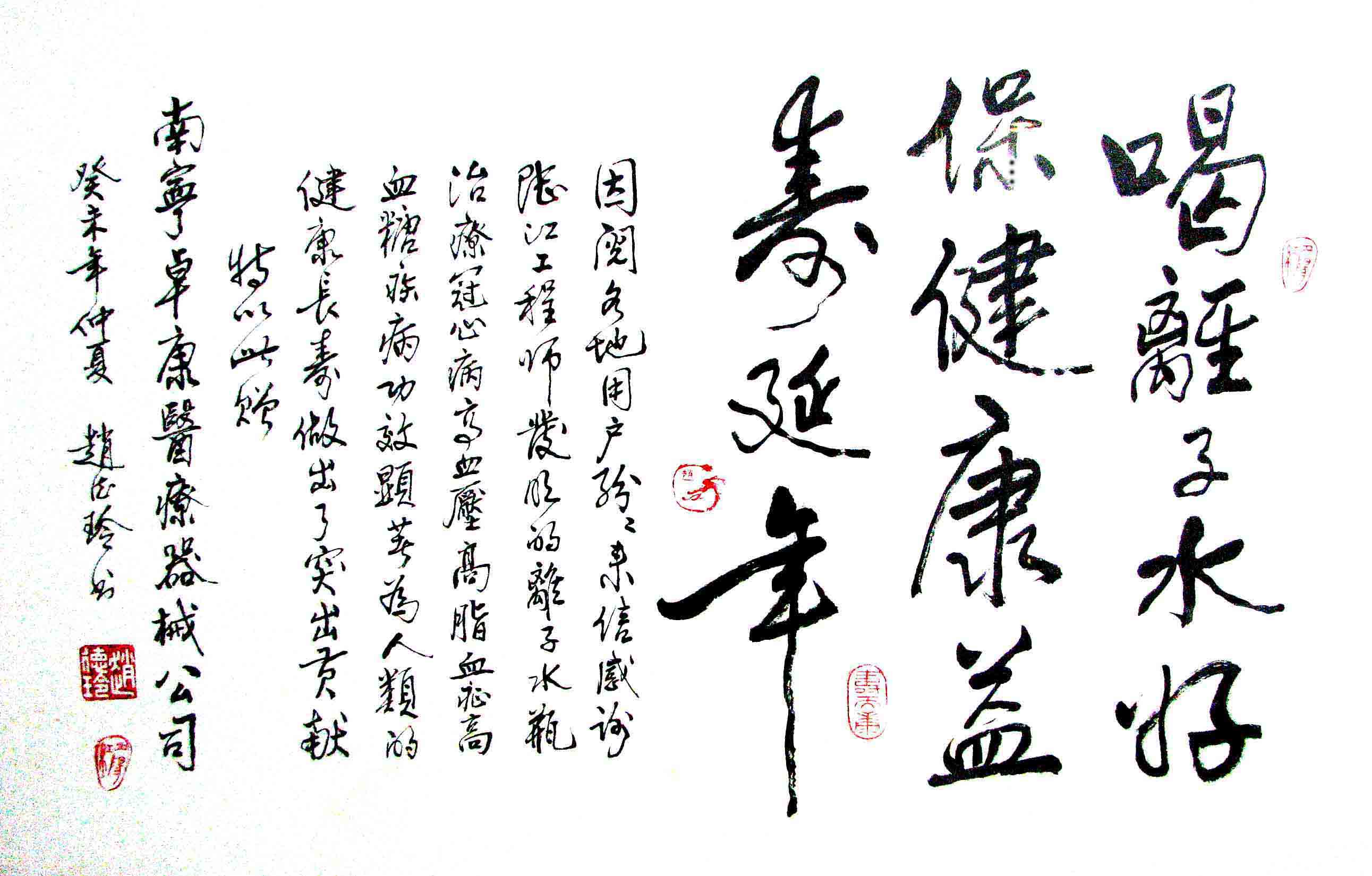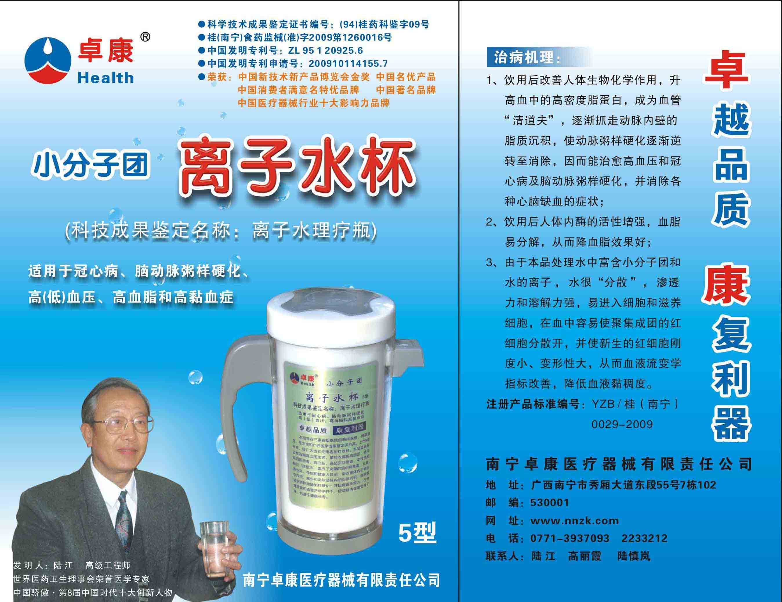 -----我是從事建筑的高工,本來沒有資格去攻克醫(yī)學(xué)難題,卻為了自身健康才扣響醫(yī)學(xué)的大門。由于我1990年患高血壓,因怕中風才研究發(fā)明了離子水瓶,我把水處理成微小分子團水,飲用后治愈了高血壓。便于1993年底送到三家省級醫(yī)院做臨床試用4個月。經(jīng)北京和廣西醫(yī)學(xué)專家鑒定:"降脂降壓效果好"," 能擴大心腦動脈流量,改善心腦電圖以及微循環(huán)","對治療心腦動脈粥樣硬化、高血壓、高血脂有良好的醫(yī)療保健作用。""產(chǎn)品的技術(shù)性能和療效達到了同類產(chǎn)品的國內(nèi)領(lǐng)先水平,經(jīng)廣西醫(yī)學(xué)科學(xué)情報研究所檢索,未見國外有類似報道。"中國醫(yī)學(xué)科學(xué)院張正國教授從美國國立醫(yī)學(xué)圖書館數(shù)據(jù)庫存Medline檢索英俄文資料,均未見類似報告。2000年上市后,我為了對消費者負責而繼續(xù)觀察研究,一直通過《信譽卡》和《質(zhì)量跟蹤調(diào)查書》向患者承諾療效,請用戶使用6個月后反饋效果。和脂壓患者飲用2至5個月內(nèi),消除癥狀,停服藥物,血壓正常;冠心病患者飲用3~5個月逐漸減輕至消除心絞痛、房顫等癥狀,不再服藥,飲用1年左右心電圖正常,經(jīng)冠脈造影掃描無明顯狹窄,表明冠心病痊愈。大量患者還反映許多衰弱器官被修復(fù),讓前列腺增生、慢性咽喉炎、慢性氣管炎、支氣管炎、慢性胃炎、腸炎和膽囊炎等不藥而愈;2型糖尿病患者是因為胰島衰弱致病,飲用該水半年至一年,逐漸減藥至停藥,血糖尿糖正常,真正治愈2型糖尿病。中風后遺癥患者飲用六七個月,可逐漸減輕至消除肢體和語言障礙,表明飲用該水能讓壽命很長的神經(jīng)元細胞逐漸修復(fù),奇跡般地恢復(fù)肢體和語言功能。飲用后還使胸腺和脾臟兩個重要的免疫器官被修復(fù)和增強,產(chǎn)生免疫細胞多,提高了免疫力,使人不生病或少生病。自此, 飲用微小分子團水創(chuàng)造了攻克冠心病、高(低)血壓和糖尿病三大醫(yī)學(xué)難題的奇跡。人們對此感到不可思議,但實踐是檢驗真理的唯一標準。